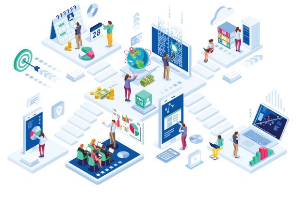 Investment and virtual finance. Communication and contemporary marketing. Future and office devices working on investments. Infographic for web banner, hero images. Flat isometric vector illustration.